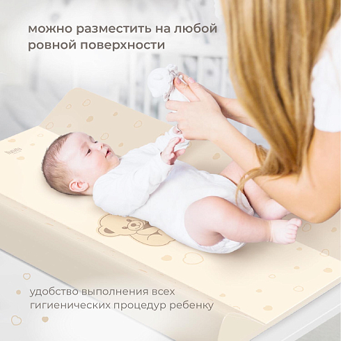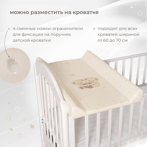 Доска универсальна, ее можно разместить на любой ровной поверхности или зафиксировать на поручнях детской кроватки. Для этого в конструкции предусмотрены съемные ножки-ограничители (6 шт.), благодаря которым доска прочно устанавливается на кровать. Она подходит для всех кроватей шириной от 60 до 70 см и позволяет с максимальным удобством выполнять все гигиенические процедуры ребенку.