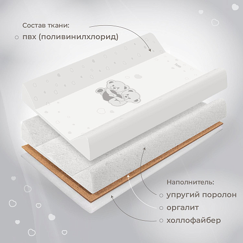 Размер изделия составляет 49х80см, в основании находится дерево, покрытое упругим поролоном и холлофайбером. Поверхность представляет собой мягкий водонепроницаемый материал. Для ухода его достаточно протирать влажной губкой. В комплекте идет натяжной чехол на резинке, который можно стирать.